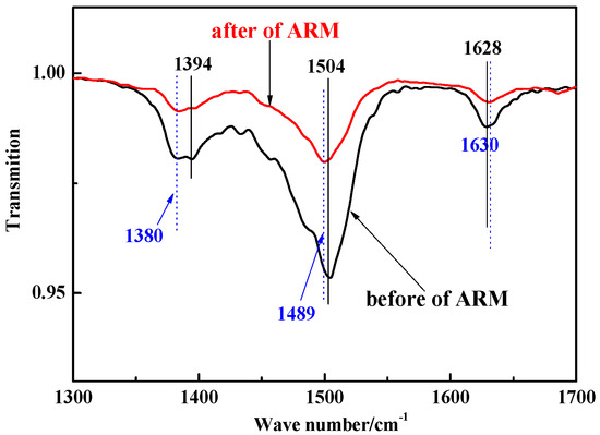 In the case of ARM, the band observed at 1628 cm−1 originated from the stretching vibration of the Fe–O bond (hematite), whereas the bands at 1394 and 1504 cm−1 were attributed to the stretching vibration of the Al–O bond (boehmite) and the bending vibration of the O–H bond, respectively. These findings suggest the presence of adsorbed water within ARM [28].