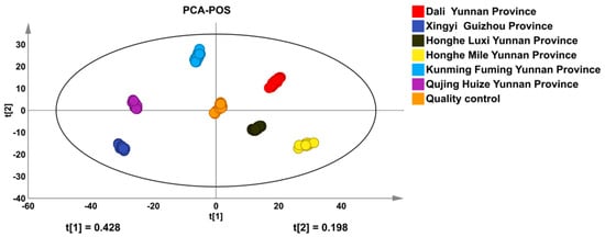 The quality control samples (QC) were mixed with a total of 120 samples. The sensitivity and stability of the instruments were monitored by QC and corrected for the subsequent data analysis. Each biological replicate of the sample was clustered together and clearly separated from the quality control (QC) sample, indicating that the variation between the samples in the group was the smallest, thus ensuring the repeatability and reliability of the laboratory, as shown in Figure 2. In addition, after consulting the Pharmacopoeia of the People’s Republic of China, the main marker compound in the Erigeron breviscapus was breviscapine. The RSD is 5.00~6.00%. Through the joint monitoring results for the breviscapine and QC samples, it can be seen that the performance of the instrument is very stable, the experimental repeatability is good, and the obtained data are acceptable and reliable.