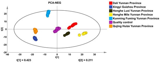 In this analysis, the compounds detected in the sample and the chromatographic peaks corresponding to RSD ≤ 30% in the QC sample were considered to be a variable, and their integrated relative area was the response variable. The compounds selected in this way can be identified as key compounds in Erigeron breviscapus, which indicates that the subsequent statistical analysis of the data is credible. The obtained data set from the chemical components retained the maximum possible variability within the conditions. In the study, thirty samples from six areas divided by three classes were drawn in the PCA. The score plot of the PCA (Figure 2) showed that the clear difference in the comparisons was mainly reflected in the difference in the peak areas of the common components from the Honghe region and other areas.
