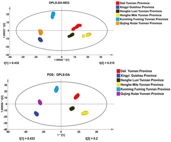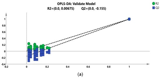 Because OPLS-DA is a supervised discriminant statistical analysis method, a permutation test is used to test the model (Figure 4). In order to avoid over-fitting in the process of model establishment, the intercept of R2 in the permutation test is generally not greater than 0.3~0.4. When the intercept between the Q2 regression line and Y axis (Q2 intercept) is <0.05, it shows that there is no over-fitting phenomenon in the model. The prediction abilities were 100% for all classes. An R2 of 0.99 is the correlation coefficient of cross validation, which indicates that the fitting degree was good. A Q2 of 0.985 represents the performance of the OPLS-DA model that can successfully predict the geographic origin in this experiment (Figure 4).