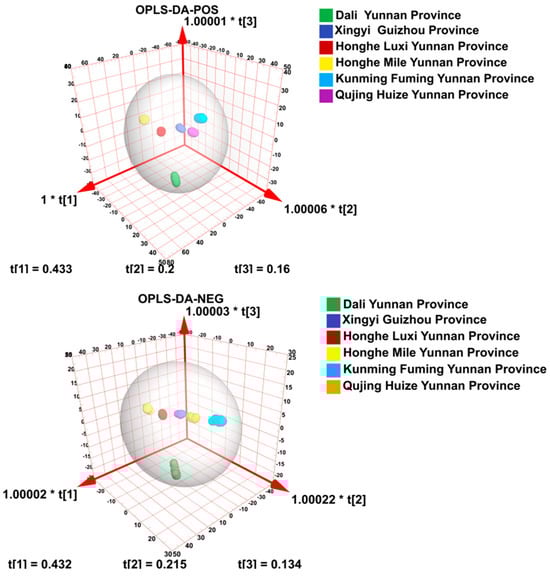 An appropriate model was established to analyze the collected data, and the OPLS-DA model was obtained. The OPLS-DA was performed to confirm the above four-classes data model. It can discriminate functions with linear combinations of the selected descriptors, and was proportional to the between-classes sum of squares and the within-classes sum of squares. The results were consistent with the PCA, which can be distinguished by the difference in the chemical components from Honghe Dengzhanhua and other areas. The prediction and discrimination ability of the model is greater than 99% (Figure 3).