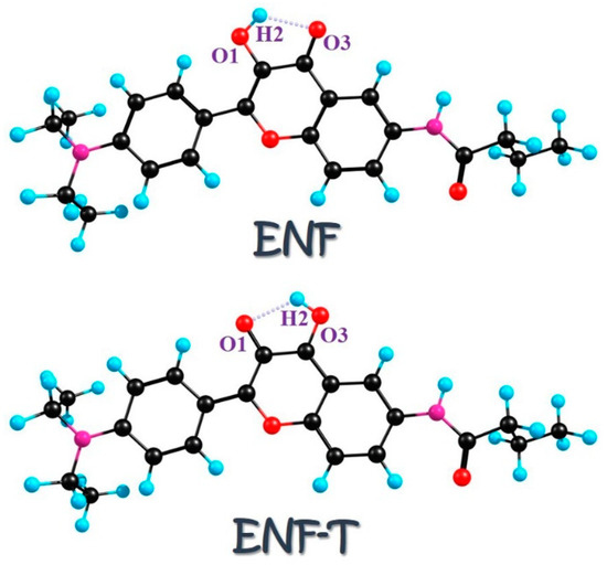 Structures of ENF and the proton-transfer ENF-T tautomer. The intramolecular hydrogen bond is also labeled.