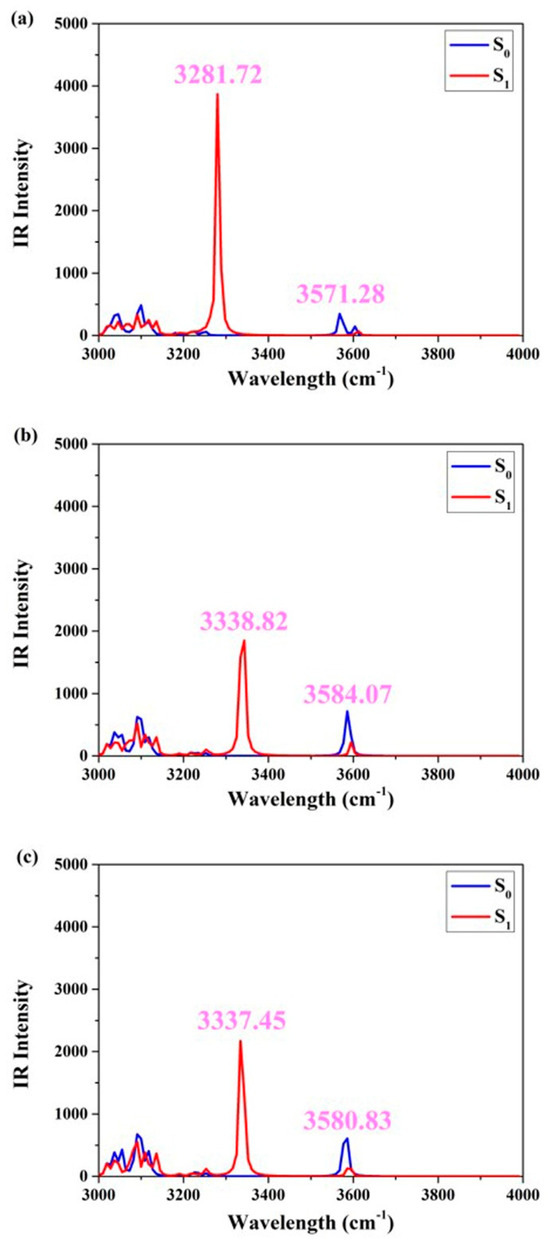 In order to facilitate a more comprehensive comparison of the similarities and disparities between hydrogen bonds in the S0 and S1 states, Figure 3 displays the infrared vibrational spectral peaks corresponding to the O1-H2 stretching vibration in the three different solvents. Evidently, within cyclohexane, dichloromethane, and acetonitrile solvents, the infrared peaks associated with the elongation vibration of O1-H2 in the S0 state are measured at 3571.28 cm−1, 3584.07 cm−1, and 3580.83 cm−1, respectively. Subsequent to photo-induced excitation, these same O1-H2 stretching vibrations exhibit an altered infrared peak position in the S1 state: specifically, at 3281.72 cm−1, 3338.82 cm−1, and 3337.45 cm−1, respectively. The O1-H2 stretching vibration in the three solvents exhibits a conspicuous redshift of the IR peak, indicating that the S1 state is highly favorable for enhancing the intramolecular hydrogen bond interaction [24,25,26]. To be more precise, this redshift measures 289.56 cm−1 (cyclohexane), 245.25 cm−1 (dichloromethane), and 243.38 cm−1 (acetonitrile), respectively. Furthermore, it reflects the alteration in solvent polarity and highlights the distinct influence of photoexcitation on hydrogen bonding. Notably, the most prominent redshift observed in nonpolar aprotic solvents underscores their significant role in promoting excited-state reactions for the ENF fluorophore.