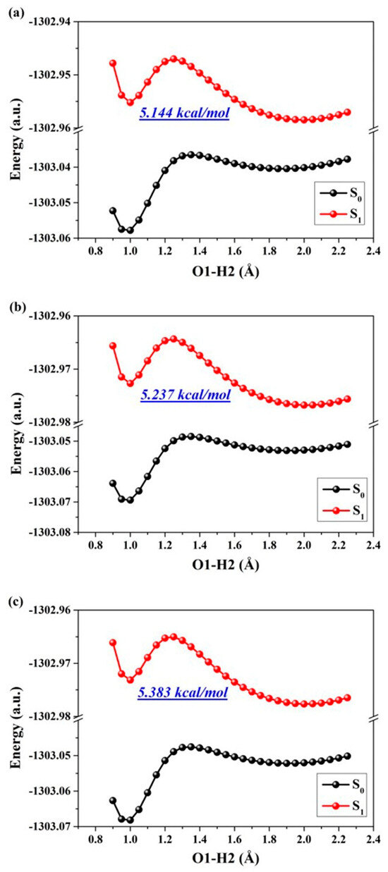 The determination of reaction processes and barriers in excited states can be achieved quantitatively by constructing PECs through a restrictive optimization approach, thereby facilitating the investigation of ESIPT reaction behaviors. It is widely acknowledged that PECs present challenges to conventional chemical reactions in excited states due to one or more alterations in geometry [13,18,30,31,32,33]. By employing a rigorous optimization method, we successfully constructed PECs while preserving an elongated O1-H2 bond distance ranging from 0.90 Å to 2.20 Å in increments of 0.05 Å, encompassing all photo-induced configurations (as illustrated in Figure 8). From a qualitative perspective, it becomes apparent that higher potential barriers hinder the PT reaction in S0 state, whereas lower barriers in S1 suggest the facile occurrence of ESIPT. Importantly, the thermodynamic feasibility of ESIPT reactions for derivatives of ENF, ENF-S, and ENF-Se is supported by their respective potential energy barriers: namely, 5.237 kcal/mol, 4.136 kcal/mol, and 3.787 kcal/mol. Therefore, considering kinetic aspects, we can assert that low atomic electronegativity promotes ESIPT reaction for these ENF derivatives. We speculate that the six-membered ring belonging to O, S, and Se will squeeze the distance between O1 and O3 relative to the atomic radius of O to S to Se increasing gradually. For this reason, the chalcogen atomic electronegativity-associated ESIPT mechanism could be revealed.