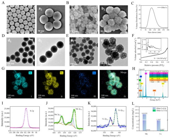 The template MSNs were synthesized by the hydrolysis of tetraethyl orthosilicate in the presence of cetyltrimethylammonium bromide (CTAB, as the structure-directing agent) and triethylmethylammonium (Et3N, which provides an alkaline catalytic environment). As indicated by SEM, the prepared MSNs displayed high specific surface areas and typical mesoporous structures with uniform pore structures and dimensions (Figure 1A). These characteristics make MSNs suitable for the surface adsorption and nucleation of nanoparticles. Therefore, the MSNs were employed as the template for material synthesis. We further loaded MnO and CaO molecules onto MSNs as described in Section 4.2. The obtained HMn-Ca nanoparticle showed a hollow and floral morphology with an average size of 100 nm, as well as uniform pore channels and dimensions with discernible mesoporous structures (Figure 1A,D). The result in Figure 1C was corroborated by SEM and TEM images, indicating that the particle size distribution of HMn-Ca primarily centers around 122.42 nm. Additionally, the synthesis method of HMn-Ca possesses advantages in terms of its simplicity, ease of operation, and subsequently enabling large-scale productions.