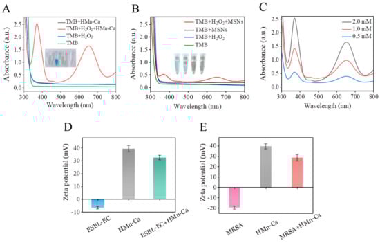 Characterizations of HMn-Ca. Changes in absorbance at 652 nm of POD-like activity are measured by (A) HMn-Ca and (B) MSNs. (C) Absorbance changes at 652 nm of POD-like activity by HMn-Ca are dependent on the dose. Zeta potential of (D) ESBL-EC and (E) MRSA after exposure to PBS or HMn-Ca.