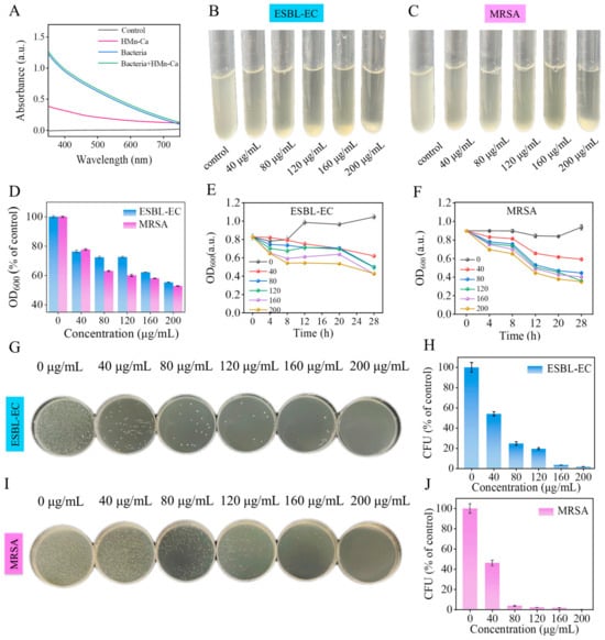 Antibacterial effects of HMn-Ca in vitro. (A) UV-vis absorbance of the material. (B,C) Photographs and (D) absorbance at 600 nm of ESBL-EC and MRSA after incubation with different concentrations of HMn-Ca. (E,F) The antibacterial activity of HMn-Ca shows absorbance changes at 600 nm, which are dependent on time. (G,I) Agar plate photographs and (H,J) the corresponding living bacteria numbers of ESBL-EC and MRSA after treatments with HMn-Ca at different concentrations.
