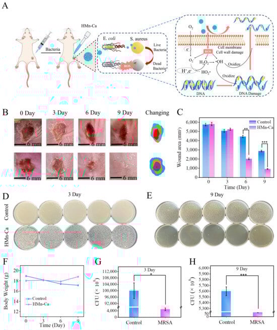 Antibacterial effects of HMn-Ca in vivo. (A) Experimental design for evaluating the antibacterial effects of HMn-Ca in mice. (B) Macroscopic views of the infected wound and (C) the corresponding wound area on days 0, 3, 6, and 9. Images of bacterial colonies rolled by MRSA of the wound tissue on (D) day 3 and (E) day 9. * p < 0.05, ** p < 0.01, *** p < 0.001. (F) The body weight of mice administered with PBS versus HMn-Ca. (G,H) Quantitative analysis of the relative bacteria viability rate in (D,E).