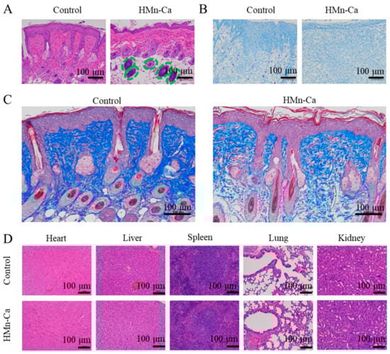 HMn-Ca promoted wound healing in mice. The skin lesions from the upper back of mice were subjected to (A) H&E staining (purple part is hair follicle tissue). (B) Giemsa staining (MRSA is dyed purple and normal tissue is blue), and (C) Masson’s trichrome staining (blue part is fibrin). The newborn hair follicles from the H&E staining image were indicated by green circles. (D) After 9 days of treatment, images of H&E staining were obtained for the major organs (heart, liver, spleen, lung, and kidney).
