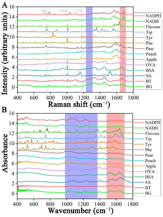 The Raman and ATR-FTIR spectra were preprocessed by normalization, multiplicative scatter correction (MSC), and the Savitzky–Golay algorithm (SG) methods. The selection of the principal components (PCs) was crucial for extracting differences between different samples and aimed to explain the direction of the maximum variance of high-dimensional data. The principal component analysis (PCA) results showed Raman data clustering (Figure 2A). The PC1-PC2 scores plot of PCA modeling of flavone and amino acids showed apparent clustering. The three types of bacteria overlapped entirely, resulting in a classification failure. The points of proteins (Bovine serum albumin, BSA; Ovalbumin, OVA, Beijing, China) overlapped bacteria and were close to nicotinamide adenine dinucleotide phosphate (NADPH, Shanghai, China). From the results, it can be inferred that the composition of bacteria was similar to these proteins and amino acids. Peach overlapped with OVA, and pear pollen was closer to nicotinamide adenine dinucleotide (NADH, Shanghai, China).