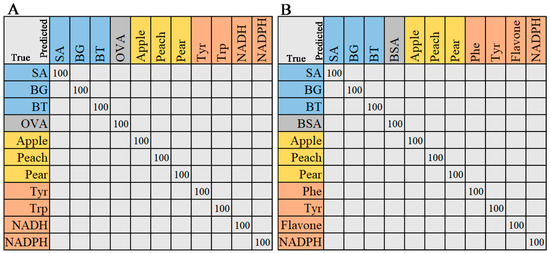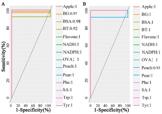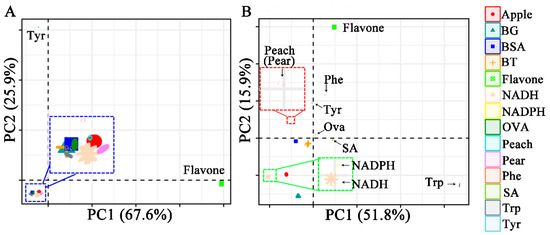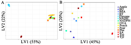 Figure 4 shows the classification plots of Raman and ATR-FTIR spectra with two X-variates. In Figure 4A, the Raman spectra of flavonoids, Phenylalanine, and tyrosine are classified, and other samples overlap. As the optimal number of components increased, the separated sample species increased. In Figure 4B, most species are correctly separated in the PLS-DA model using the first two latent variables (LVs). However, two samples overlap in pairs: peach pollen and pear pollen. Two types of bacteria, BT and SA, were closer to BSA and OVA.