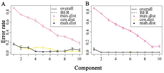 For the development of a better bacterial identification model, partial least squares discriminant analysis (PLS-DA) was used to classify the unknown samples with the mixOmics package of R (version 4.3.1) on Raman and ATR-FTIR spectra. This model’s optimal number of components was selected based on the minimum balanced error rate (BER). The classification error rate was determined using five-fold random cross-validation, and the model performance was evaluated using the perf function in the R package, which was repeated ten times. As depicted in Figure 3A, the Mahalanobis distance (mah. dist) in Raman spectral data was at its minimum when the component number was 5. As the component number increased, the Mahalanobis distance initially rose and then declined. As shown in Figure 3B, the minimum Mahalanobis distance in FTIR spectral data was obtained at a component number of 2 and remained unchanged as the number increased.