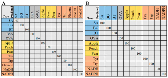 The confusion matrix was generated by the SVM model. (A) Raman spectra, (B) ATR-FTIR spectra. The entries in the matrix represent the true categories (rows) and the predicted categories (columns). The values on the diagonal line represent the precision of predictions for each category.