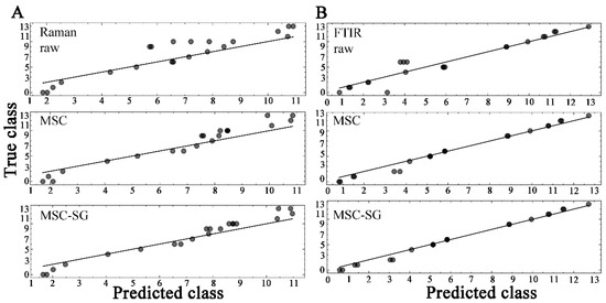 The regression results were derived from the RF model. (A) Raman spectra, (B) ATR-FTIR spectra. The spectrum is subjected to processing using three data processing methods. The more sample points on a straight line, the higher the accuracy of the model.