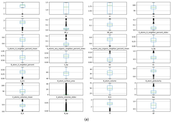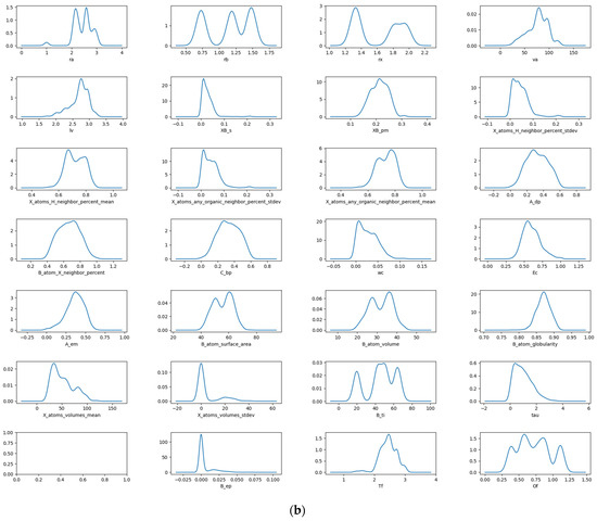 The data are visualized and analyzed using a box plot and density map. The distribution and outlier of the data can be judged by observing the position and size of the box, the length of the longitudinal line, and the outlier points. Figure 1a shows the box plot of stability data. It can be observed that there are obvious outliers in the data of seven descriptors: crystal length, standard deviation of proportion for B and X atoms, percentage standard deviation of adjacent atoms in X position, sphericity of the B atom, standard deviation of the volume for atom at X position, and crystal structure at B element. The removal of these anomalous data is necessary during the process of feature manipulation. The density diagram of the data set about stability is shown in Figure 1b. The distribution and skewness of the original data in the data set can be assessed by examining the density curve. The majority of the density curves exhibit a unimodal symmetric distribution, implying a uniform data distribution. The density curves of these two descriptors, crystal structure at B element and standard deviation of the volume for an atom at X position, show left or right skew, indicating that there is skew in the data. The density curves of the radius of the B-site ion, the radius of the A-site ion, and the third ionization energy of the B element have multi-peak distributions, suggesting the presence of diverse data distributions.