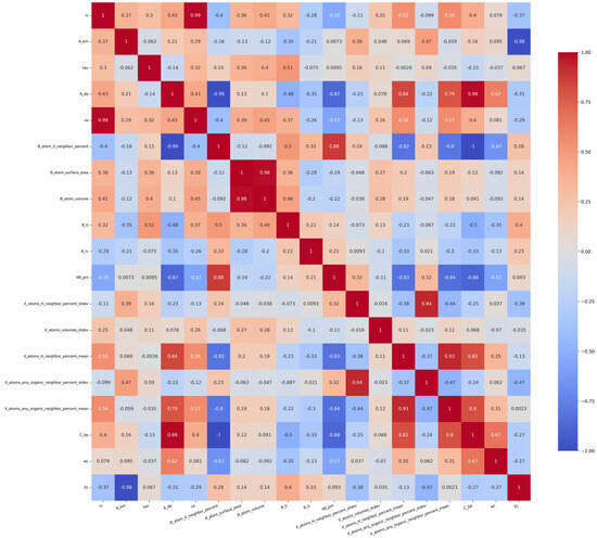 The value of the Pearson correlation coefficient ranges from −1 to 1, where −1 means a complete negative correlation, 1 means a complete positive correlation, and 0 means no linear correlation. Firstly, unnecessary features are eliminated to reduce the dimension of the data set. In order to eliminate the influence of unnecessary features on the accuracy of the prediction model, 28 features whose correlation coefficient is close to 0 were excluded. The data set was initially screened by the derived correlation coefficient. The correlation coefficient among the ra, rb, B_ep, Tf, Of, X_atoms_volumes_mean, X_atoms_volumes_stdev, B_atom_globularity, XB_s, and rx is all in the range of 0–0.2, indicating that these features are not correlated. Therefore, the above features are not taken into consideration in predicting Ehull. We removed irrelevant features and retained the related features of lv, A_em, tau, A_dp, va, B_atom_X_neighbor_percent, B_atom_surface_area, B_atom_volume, B_ti, B_lc, XB_pm, and X_atoms_H_neighbor_percent_stdev, X_atoms_volumes_stdev, X_atoms_H_neighbor_percent_mean, X_atoms_any_organic_neighbor_percent_stdev, X_atoms_any_organic_neighbor_percent_mean, C_bp, wc, and Ec. The Pearson correlation coefficient of these features is shown in Figure 2. The gradient color bar on the right corresponds to the magnitude of the correlation coefficient. The color red indicates a positive correlation, while blue signifies a negative correlation; furthermore, the intensity of the color corresponds to the strength of the correlation.