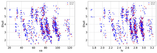 After the Pearson correlation analysis, redundant features with particularly high linear correlations were screened out and scatter plots were drawn between crystal length, crystal volume, and target variables, as shown in Figure 3. The diagram shows the relationship between the two variables and Ehull. In the scatter plot, each data point represents a sample, blue is the point of the training set, red is the point of the test set, and its x-axis and y-axis coordinates represent the values of the two variables, respectively. By observing the distribution and trend of data points in the scatter plot, it is found that the relationship between va and lv and Ehull has a nonlinear relationship.