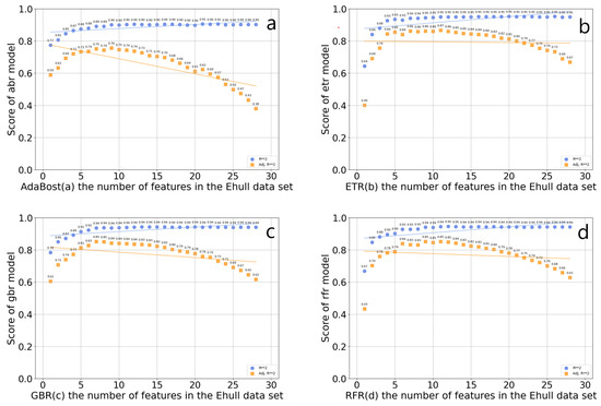 Scores of the four algorithms AdaBoost (a), ETR (b), GBR (c), and RFR (d) on the number of features in the Ehull data set.