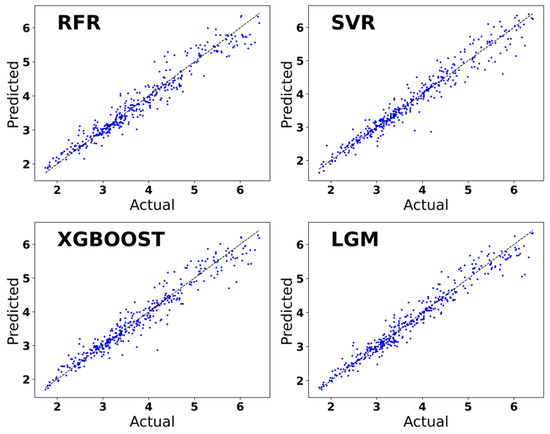 The performance of the prediction model utilizing four machine learning algorithms, RFR, SVR, XGBoost, and LightGBM, is shown in Table 1. The R2 of the LightGBM regression model is 0.953914, which measures the proportion of variance between the predicted value and the true value. The R2 value ranges from 0 to 1, and the closer it approaches 1, the higher the predictive power of the model. The MAE value is more sensitive to small prediction errors, while the MSE value is more sensitive to large prediction errors. The MAE value of the LightGBM regression is 0.1664, which is the minimum value among the four algorithms. And the MSE value of the LightGBM regression is 0.0531, which is also the smallest among the four models and is closest to 0. The MAE and MSE values indicate that the LightGBM regression model exhibits a smaller prediction error.