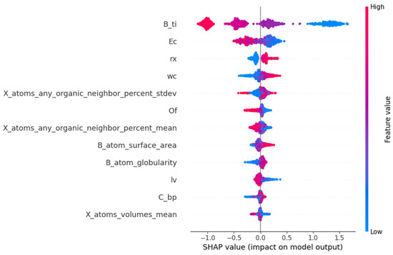 The SHAP method is invaluable for model interpretation and feature selection. It can also serve to validate the accuracy and reliability of the model, identify the weaknesses of the model, and propose improvement schemes. From the interpretation diagram of the SHAP model, the contribution degree of each feature to the prediction results, and the direction and degree of influence of the feature value can be understood. The input feature subsets of the prediction model established by the LightGBM algorithm are rx, lv, X_atoms_any_organic_neighbor_percent_stdev, X_atoms_any_organic_neighbor_percent_mean, C_bp, wc, Ec, B_atom_surface_area, B_atom_globularity, X_atoms_volumes_mean, B_ti, and Of, which are picked out by the RFR algorithm. The SHAP method decomposes the contribution degree of each feature to the prediction result into the sum of the contribution degree of different feature subsets.