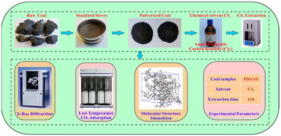 The raw coal (PDS and JZ) was pulverized into 60–80 mesh and dried at 105 °C for 12 h. Then, it was subjected to the CS2 extraction experiments with a soxhlet extractor. In the experiment, 10 mL CS2 solvent were consumed per gram of coal sample, and the extraction time lasted 12 h. After the CS2 solvent-extracted treatment, the extracted coal samples were labeled PDST and JZT. The extracted coal samples were placed in a drying oven at a drying temperature of 105 °C. The coal sample was weighed every four hours until the weight change of the coal samples was less than 0.01 g and the samples were considered dry to constant weight. The extracted coal was measured by XRD and low-temperature CO2 adsorption. The experimental and measuring procedures are shown in Figure 1.