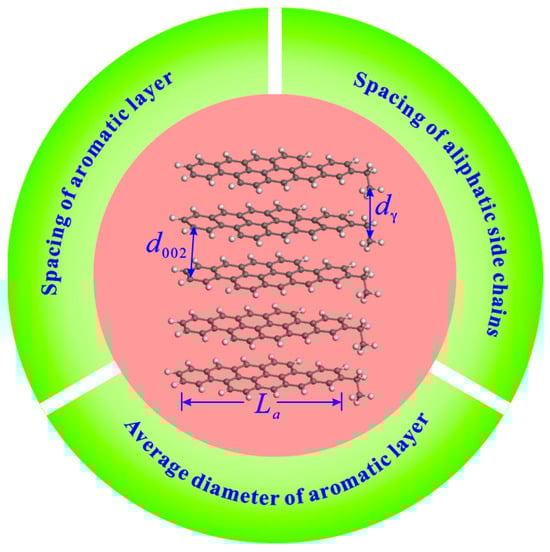 XRD measurement with copper Ka radiation (40 kV, 40 mA) was performed on raw and extracted coal samples with particle sizes of below 200 mesh by a D8 Advance X-ray diffractometer. The scanning range was 10–80°, the scanning speed was 2.0° per minute, and the step size was 0.02°. The coal microcrystalline parameters, including the chain spacing of aliphatic side chains (dγ), spacing of aromatic layers (d002), and average diameter of aromatic layers (La), can be obtained through the XRD analysis (Figure 2). The calculation formulas of these parameters are follows.