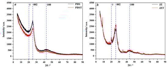 XRD spectra of raw and extracted coal: (a) PDS and PDST samples, (b) JZ and JZT samples.