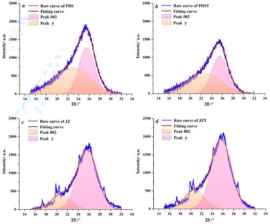 Peak fitting for peaks 002 and γ: (a) sample PDS, (b) sample PDST, (c) sample JZ, (d) sample JZT.