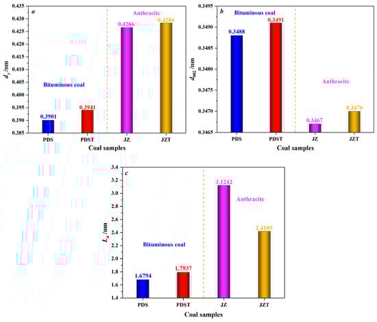 As for anthracite, its dγ increases from 0.4266 to 0.4284 nm after CS2 extraction (Figure 5), which indicates an increase in the spacing of aliphatic side chains. However, such an increase is inferior to that of the dγ of CS2-extracted bituminous coal, mainly because anthracite has a low content of aliphatic structures [70,71]. Moreover, anthracite’s d002 increases from 0.3467 to 0.3470 nm after CS2 extraction, marking an increase in aromatic layer spacing. The decrease in La of CS2-extracted anthracite reflects a reduction in the aromatic layers’ average diameter. In addition, the La of THF-extracted anthracite also shows a decrease [67], but this decrease is less than that of CS2-extracted anthracite. What causes the above difference can be explained as follows: THF, a polar solvent, mainly affects the oxygen-containing functional groups [73,74], but anthracite, with a high degree of coalification, has few oxygen-containing functional groups and aliphatic structures [70,75]. By contrast, CS2, as a non-polar solvent [46], has excellent extraction and transformation effects on the aromatic structures of anthracite, causing a significant decrease in La.