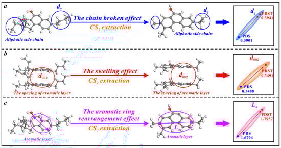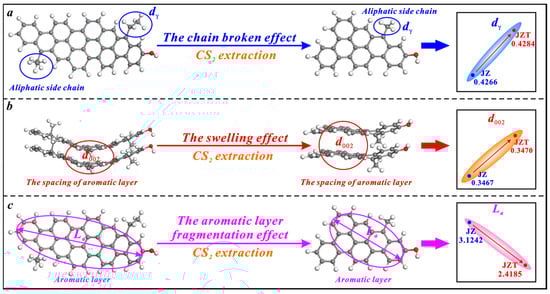CS2 extraction has triple effects on the microcrystalline structure of bituminous coal, i.e., the broken chain effect, swelling effect, and aromatic ring rearrangement effect (Figure 6). Bituminous coal contains a large number of chemical aliphatic structures [71,76], and CS2 extraction increases the dγ by breaking and shortening them (Figure 6a). The previous research demonstrates the irreversible swelling effect of cyclohexanone (CYC) extraction on the microcrystalline structure of bituminous coal. The molecules of CYC solvent tend to continuously penetrate the aromatic layers of coal and increase their spacing [77]. In this study, the solvent CS2 also displays an irreversible swelling effect on the microcrystalline structure of bituminous coal. When CS2 molecules penetrate the aromatic layers of bituminous coal, the d002 is promoted (Figure 6b). The microcrystalline structure cross-linking degree is reduced under the broken chain effect and the swelling effect, which causes an aromatic ring rearrangement effect to increase the La (Figure 6c).