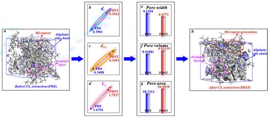 Effects of CS2 extraction on micropores of bituminous coal: (a) molecular structure of coal sample PDS, (b) variation in dγ, (c) variation in d002, (d) variation in La, (e) variation in average pore width, (f) variation in pore volume, (g) variation in pore area, (h) molecular structure of coal sample PDST.