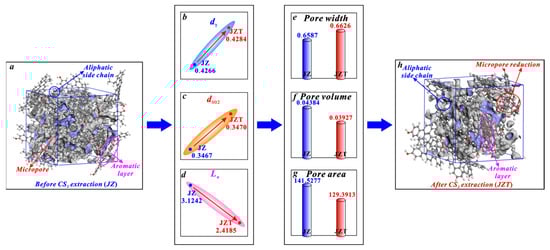 The micropores of bituminous coal mainly arise from the spacing between the aliphatic structure and aromatic structure (Figure 8). CS2 extraction enlarges the spacing of aliphatic side chains (dγ) with its broken chain effect (Figure 8b) and enlarges the spacing of aromatic layers (d002) with its swelling effect (Figure 8c), providing space for micropore generation [38,79]. Moreover, with its aromatic ring rearrangement effect, CS2 extraction increases the average diameter of aromatic layers (La) (Figure 8d). This promotes the generation of micropores since micropores are mostly formed between the layers of two microcrystallites [36,80]. In this way, the above triple effects of CS2 extraction jointly promote the micropore generation of bituminous coal, among which the aromatic ring rearrangement effect plays a dominant role in controlling micropore generation. In detail, after a CS2 extraction treatment, bituminous coal experiences an average pore width decrease from 0.6784 to 0.6773 nm (Figure 8e), a micropore volume growth from 0.01881 to 0.02119 cm3/g (Figure 8f), and a micropore area growth from 58.7112 to 66.6038 m2/g (Figure 8g).