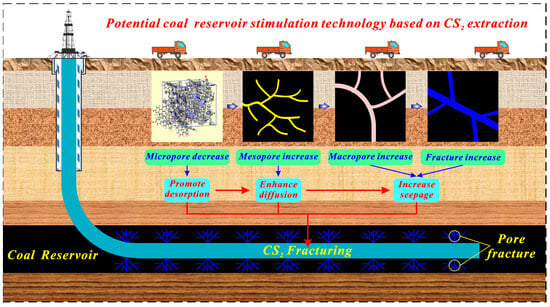Figure 10 indicates the diagram of potential reservoir stimulation technology–CS2 fracturing of a horizontal well in anthracite reservoirs. Coal reservoirs contain multi-scale pore and fracture structures, which influence the desorption–diffusion–seepage capabilities of coalbed methane [83]. The micropore is the major space where CBM is adsorbed and stored [84,85]. CS2 extraction, with a micropore enlargement effect on anthracite, can increase its average micropore size and decrease its micropore volume and area, which is conducive to gas desorption. Besides, as proven in our previous research, CS2 extraction can increase the mesopore and macropore volume significantly and generate a large number of microfractures in anthracite [46,82], which is conducive to gas diffusion and seepage. Therefore, CS2 extraction is conducive to “promote desorption–enhance diffusion–increase seepage” for improving the gas migration ability for anthracite. Further, CS2 can be considered the fracturing fluid to establish the novel reservoir stimulation technology, which has effective transformation and stimulation effects to avoid the water-locking effect of water-based fracturing fluid. However, the micropore generation effect of CS2 extraction on bituminous coal may enhance the adsorption capacity of coal reservoirs, which may be not conducive to gas desorption. Significantly, our previous study demonstrated that CS2 transformation microfractures in coal reservoirs have a time effect [46]. Extending the extraction time for CS2 to transform micropores in bituminous coal may have a potential micropore enlargement effect. Such a transformation effect on bituminous coal remains uncertain and requires further research.