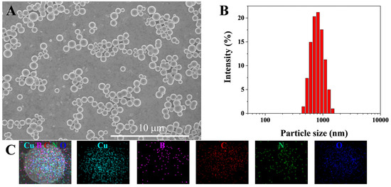 SEM image (A), size distribution (B), and EDS elemental mapping pictures (C) of FPBA-Cu-MOF.