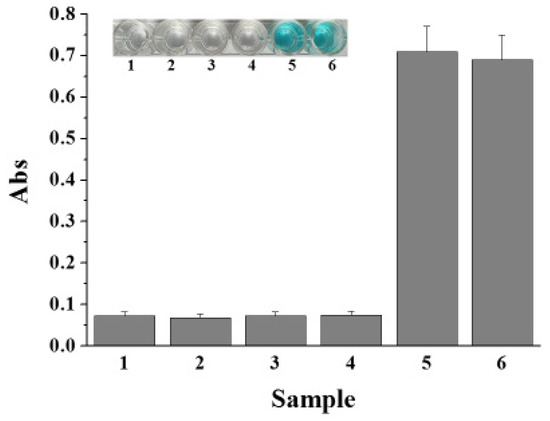 The selectivity of the established method against the non-targets was evaluated by the cross-reactivity with other proteins at the concentration of at least 10-fold higher than that of PSA, including two common serum proteins (BSA and IgG), a cancer biomarker (CEA), and a protease (thrombin). As shown in Figure 6, the absorbance value at 670 nm was negligible, and there was no identifiable blue color for the tested non-targets of BSA, CEA, thrombin, and IgG (bars 1~4). This indicated that the immunoassay exhibited excellent selectivity due to the specific antigen–antibody interaction and the low non-specific adsorption of the signal label. Additionally, the anti-interference was challenged by determining PSA in the presence of the four non-targets. No significant differences in the solution color and absorbance intensity were observed for the target assay in the absence and presence of the non-targets (bars 5~6). The good anti-interference of the method should be attributed to the high sensitivity and selectivity of the immunoassay platform.