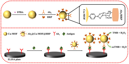 Schematic representation of sandwich-like colorimetric immunoassays with boronic acid-modified Cu-MOFs to load recognition antibody and HRP for dual signal amplification.