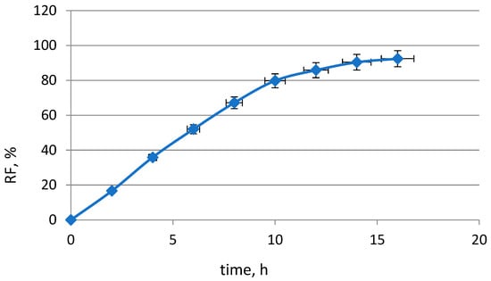 Kinetic parameters such as the permeability coefficient (P) and initial flux (Ji) were calculated according to the equations presented in previous works [,,]. The results are presented in Table 1. The rate constant of this transport process was 0.158 h−1. The recovery factor (RF) of Pd(II) was 92.4%. As can be seen, the transport of Pd(II) across PIMs with TBAB is very effective and the results can be recognized as promising. For comparison, the use of a magnetic sorbent containing an organophosphate extractant resulted in the sorption efficiency of palladium(II) reaching 71% in one cycle. Yudaev et al. [] reported that only when the sorbent was treated with 5 M hydrochloric acid was the palladium completely extracted from the sorbent.