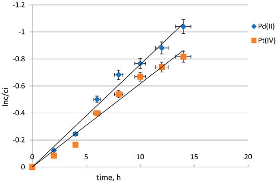 Relationship of ln(c/ci) vs. time for Pd(II) and Pt(IV) transport through PIMs; source phase: 0.001 mol·dm−3 Pd(II) and 0.001 mol·dm−3 Pt(IV) in 0.1 mol·dm−3 HCl, receiving phase: 0.5 mol·dm−3 thiourea in 0.1 mol·dm−3 HCl.