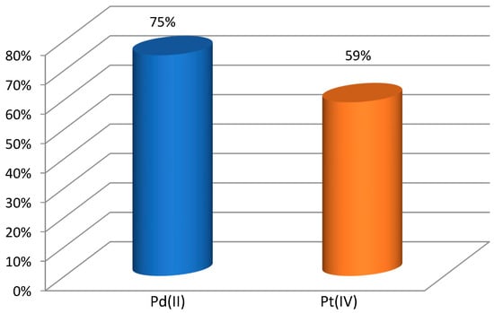 The selectivity of the extraction of palladium(II) towards platinum(IV) from 0.1 mol·dm−3 HCl was also studied. Figure 5 presents a graph of the dependence of ln(c/ci) vs. time for Pd(II) and Pt(IV) across PIMs with TBAB. For the receiving phase, 0.5 mol·dm−3 thiourea in 0.1 mol·dm−3 HCl was used. The values of the transport rate, permeability coefficient, selectivity order and selectivity ratio for the competitive transport of the metal ions under investigation are summarized in Table 2. In the presence of Pt(IV), the transport rate of Pd(II) differed from that in the single metal system. The results show the permeability coefficients of Pd(II) and Pt(IV) across PIMs with a TBAB decrease in the sequence Pd(II) > Pt(IV). The recovery factors (%) of Pd(II) and Pt(IV) are shown in Figure 6. The highest recovery factor was obtained for Pd(II) and was over 75%. According to the data in the literature, Pt(IV), like Pd(II), occurs as the anionic complex PtCl62−. As can be seen, despite everything, palladium(II) was transported more efficiently into the receiving phase. Yudaev et al. [] reported that ILs increase the efficiency and selectivity of metal extraction by several orders of magnitude, and they can be isolated by re-extraction and reused for other separation processes such as solvent extraction, adsorption, and membrane separation.