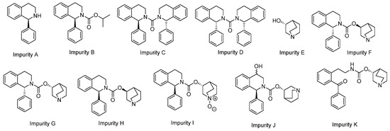 Although these synthetic routes are efficient, they may result in process-related impurities. In fact, most impurities described in the literature are formed during the synthesis process (e.g., impurities A–H, Figure 1). Others may arise from SFC degradation following processes such as oxidation, as seen in Impurities I–K (Figure 1) [5,6,7,8,9,10,11,12,13].