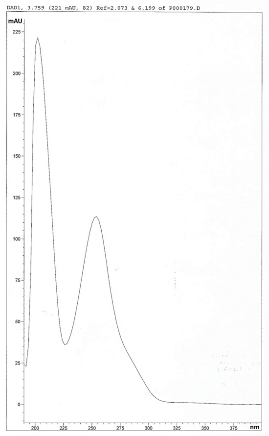 Importantly, once Impurity K was synthesized, an HPLC-MS method for its identification and differentiation from Impurity I, which has the same molecular weight, was designed and developed. Standard of Impurity I has been synthesized by us following the procedure already reported [19]. Thus, SFC and Impurities I and K were distinguished firstly by comparison of the retention times of the three compounds separately by using an XBridge C18 (Waters) column 250 × 4.6 mm (particle size: 5 µM) as the stationary phase and a buffer of ammonium acetate and acetonitrile at pH = 7 as the mobile phase, with a UV detector set at 220 nm (Table 1). Secondly, the UV spectra of the three compounds were compared. While solifenacin and Impurity I exhibited a broad, strong peak at 210 nm, Impurity K displayed an additional prominent band at 250 nm. This secondary band suggests increased conjugation within the molecule, a characteristic of the benzophenone unit of Impurity K (Figure 2).