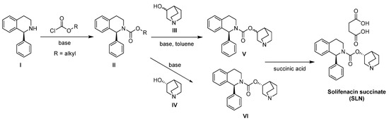 Two routes of synthesis of solifenacin succinate (SLN).
