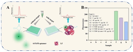 Recent work by Qu’s group using CE-SELEX to gain aptamers against Lf with equilibrium dissociation constants (KD) of 20.74 nM has laid the aptasensor-related groundwork for Lf detection [22]. Aptamers are short strands of ssDNA or RNA, generally 15–90 nt in length with secondary structures such as hairpins and pseudoknots, and molecular weights of approximately 5–15 kDa, selected via the systematic evolution of ligands by exponential enrichment (SELEX) [23,24]. Aptamers are functionally similar to antibodies with high specificity and affinity, which has led to the term “chemical antibody” [25]. They are easy to produce through in vitro chemical synthesis and therefore have little variation between batches, are relatively inexpensive, are usually supplied as stable powders, can be stored for long periods at temperatures of 4 °C or even RT, and are therefore more readily available than antibodies stored at ultra-low temperatures [26,27]. In addition, aptamers have a fairly small molecular size, low immunogenicity, easy cell entry, and high bioavailability, and thus have potential applications in aptamer drug discovery, disease diagnosis, and therapy [28,29]. Furthermore, aptamers can be chemically modified, structurally chimeric, open to signal enhancement and amplification, enzyme-catalyzed, programmed, and combined with advanced materials to create multifunctional and versatile aptasensors for environmental detection, food safety, and disease diagnosis [30,31]. Among them, fluorescence-based aptasensors are the most frequently applied approaches because of their high responsiveness, great sensitivity, and general availability [32]. Depending on how the fluorescence signal is generated, the corresponding sensors can be classified into unlabeled and labeled types [33]. The unlabeled type usually uses dyes with some toxicity such as SYBR Green and PicoGreen as signal labels [34,35]. The labeled type often involves complex probe preparation, stringent enzyme involvement, and synthesis of nanomaterials, which increases the sensitivity and at the same time increases the difficulty of practical operation, limiting their practical applications [36]. Therefore, there is still room for improvement in the simplicity required for the convenient determination of Lf.