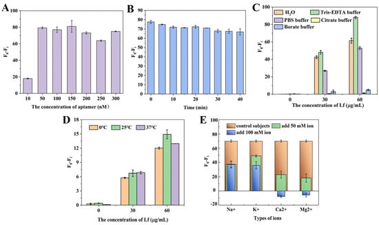 The optimizations of (A) the concentrations of aptamer at 10, 50, 100, 150, 200, 250, and 300 nM; (B) the incubation time between aptamer and Lf at five-minute intervals for 40 min; (C) the buffer solution by Tris–EDTA, PBS, H2O, citrate buffer, and boric acid buffer; (D) the reaction temperatures at 0, 25, and 37 °C; and (E) the ionic species (Na+, K+, Ca2+, Mg2+) and their strength at 50 mM and 100 mM.