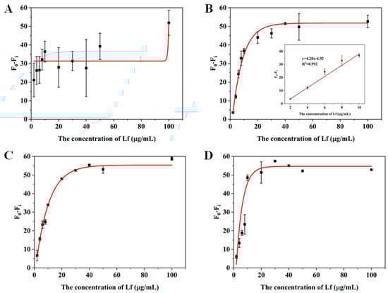 Under the optimization conditions, the sensitivity of the sensing system was evaluated with a standard Lf solution at various concentrations ranging from 2 to 100 μg/mL. As can be observed in Figure 3A, the fluorescence difference gradually increased with the increase in Lf concentration and reached a steady state when the concentration exceeded 30 μg/mL. A good calibration curve with a reliable correlation coefficient (R2) of 0.998 was fitted in the range of 2–10 μg/mL (Figure 3A inset) based on the linear relationship between the fluorescence difference (F0 − Fi, vertical coordinate) and the Lf concentration (horizontal coordinate). The error bars are based on three measurements made in parallel at different concentrations. Meanwhile, the regression equation was derived as y = 6.45x − 9.15, along with a limit of detection (LOD) of 0.68 μg/mL (8.18 nM) based on the 3σ (σ = α/k, α = 1.4611 is the standard deviation of the blank signal, k = 6.45 is the slope of the standard curve). Thus, it could be concluded that the self-assembled and self-responding fluorescence aptasensor was capable of the quantitative determination of Lf. Although the LOD is moderate compared to other reported methods (Table 1), it is fully in accordance with the maximum allowable use such as in the US, EU, and China, together with a convenient “mixing-and-detecting” operation. Furthermore, these ELISA methods in Table 1 are based on the immune reaction between Lf and its antibodies, which are expensive reagents and complex preparations.