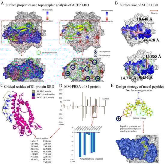 Analysis of ACE2–S protein interaction and functional peptide design. (A) Surface properties and topographic analysis of ACE2 LBD. (B) Surface size of ACE2 LBD. (C) DSV analysis of critical residue of S1 protein RBD. (D) Residue contribution analysis of S1 protein by MM-PBSA method. (E) Design strategy of novel peptides.