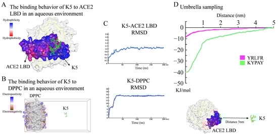 Molecular simulation analysis of peptide. (A) Binding behavior of K5 to ACE2 LBD in aqueous environment. Snapshots of K5-ACE2 LBD system after 200 ns simulation. (B) Interaction between K5 and DPPC bilayer membrane in aqueous environment. Snapshots of K5-DPPC system after 200 ns simulation. (C) RMSD values of K5-ACE2 LBD system and K5-DPPC system. (D) US simulation and ΔG values of K5 and Y5 bound to ACE2 LBD.