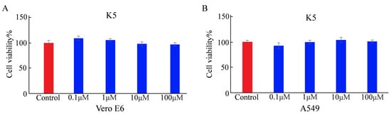 Cytotoxicity of K5 analyzed by MTT assay. (A) Cell viability of Vero E6 cells incubated with K5 at concentrations of 0.1, 1, 10, and 100 μM for 24 h. (B) Cell viability of A549 cells cultured with K5 at concentrations of 0.1, 1, 10, and 100 μM for 24 h.
