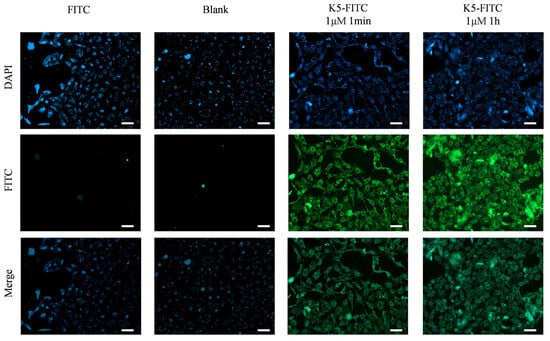 The evaluation of the effectiveness of a receptor antagonist relies heavily on its target affinity [33]. Remarkably, as depicted in Figure 4, an obvious green fluorescence was detected in the presence of 1 μM of K5-FITC after only 1 min, and it became much stronger after 1 h, suggesting a very high cellular adsorption rate of the functional peptide. In contrast, untreated cells (Blank) and cells treated solely with FITC (FITC) did not exhibit any fluorescence, indicating that K5 has the ability to effectively adsorb onto cells.