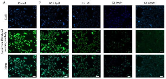 To verify the ability of K5 to hinder the binding of ACE2 and the S protein, Vero E6 cells and A549 cells were cultured in 24-well plates for 24 h, then pre-incubated with K5 at different concentrations (ranging from 0.1 to 100 μM) for 1 h and washed with PBS containing heparin three times. Then, the Vero E6 cells were co-incubated in a 6 h treatment with 10 μg/mL SARS-CoV-2 S1 protein and rinsed three times. Following this, the SARS-CoV-2 S1 protein was stained with a primary antibody (anti-spike rabbit polyclonal primary antibody, 1:100) and an Alexa Fluor-labeled secondary antibody (goat anti-rabbit secondary antibody, 1:500) for 2 h and washed three times. Then, the cells were stained with DAPI for 30 min. Finally, the cells were washed three times with a PBS solution containing heparin and fixed with 4% PFA. The cells were sequentially treated with S1 protein, primary antibody, and secondary antibody under the same conditions. The control-group cells were not treated with K5 but were treated with S1 protein, primary antibody, and secondary antibody in the prescribed protocol under the same conditions.